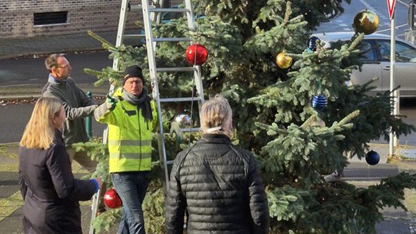 Gewohnt professionell und eingespielt haben wir heute den Weihnachtsbaum vor der Emmauskirche errichtet, mit Lichtschlangen versehen und Kugeln behangen.